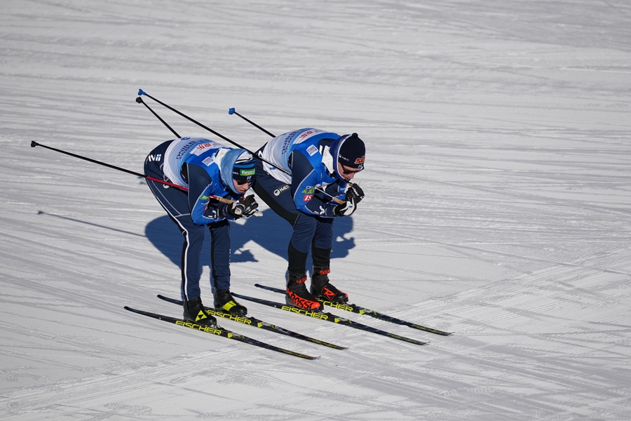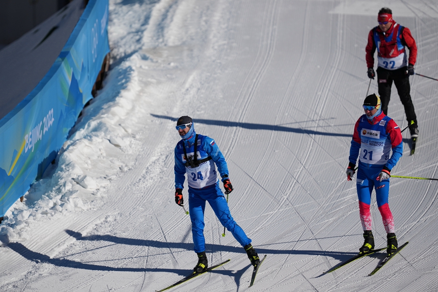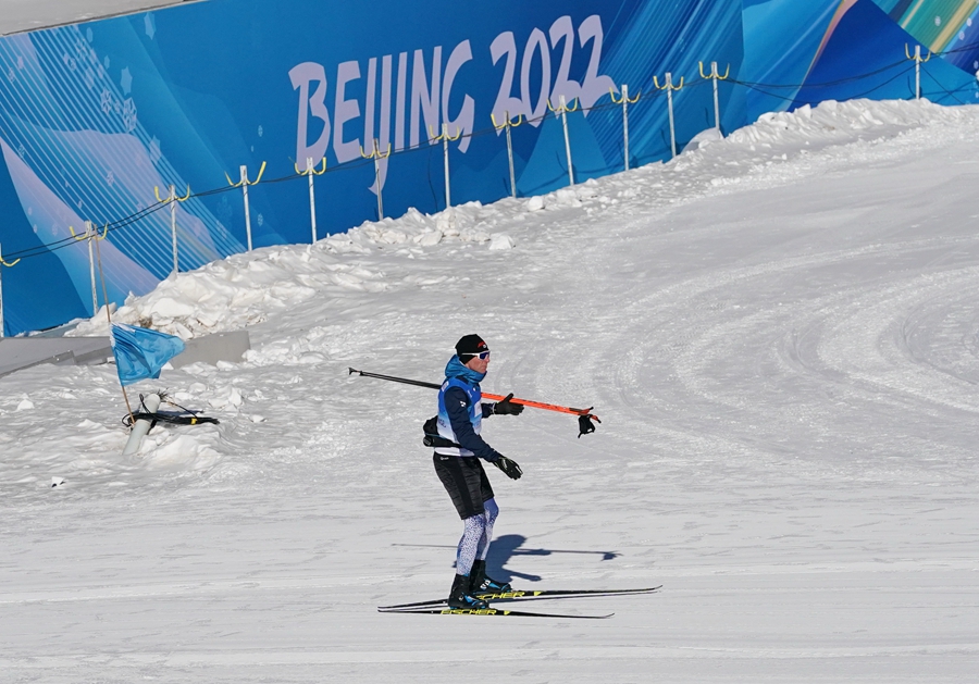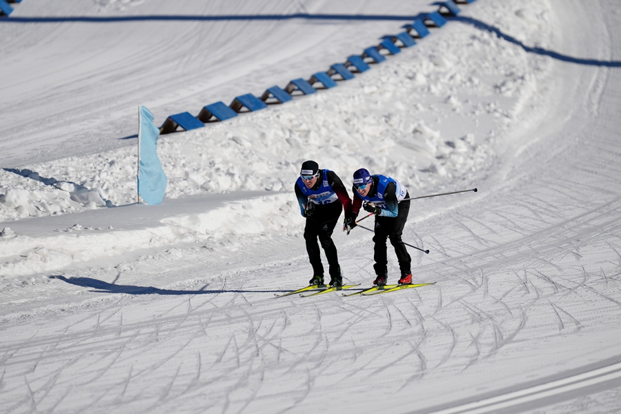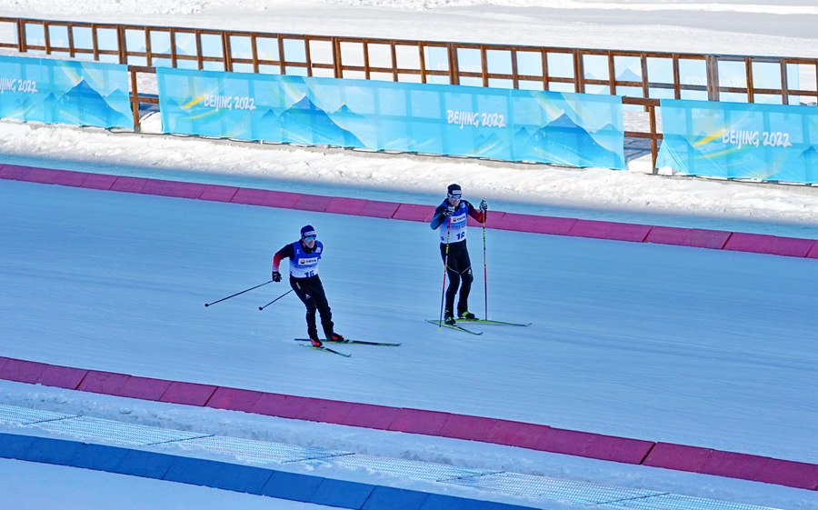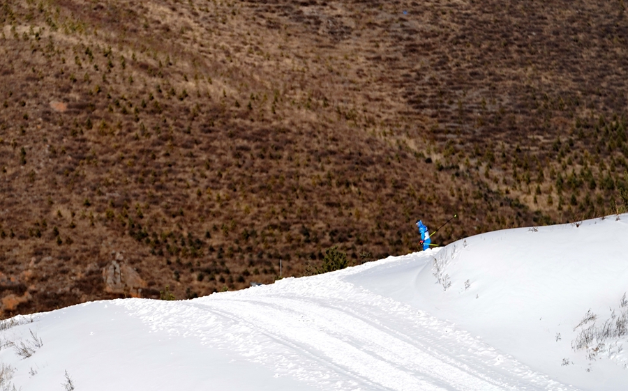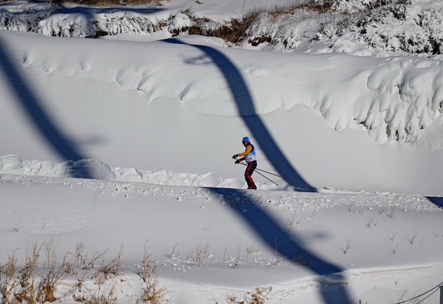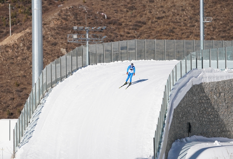 ↑12月28日,参与人员在国家冬季两项中心赛道上滑行。
