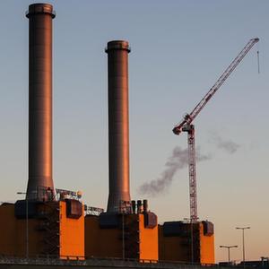 2021年10月9日在德国首都柏林拍摄的一座正在拆除烟囱的热电厂。该热电厂为实现碳中和目标在拆除厂内的三座烟囱及锅炉房。(新华社记者单宇琦摄)