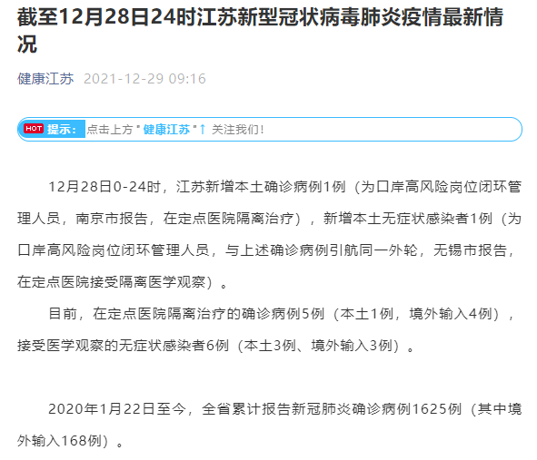 12月28日0-24时,江苏新增本土确诊病例1例(为口岸高风险岗位闭环管理人员,南京市报告,在定点医院隔离治疗),新增本土无症状感染者1例(为口岸高风险岗位闭环管理人员,与上述确诊病例引航同一外轮,无锡市报告,在定点医院接受隔离医学观察)。