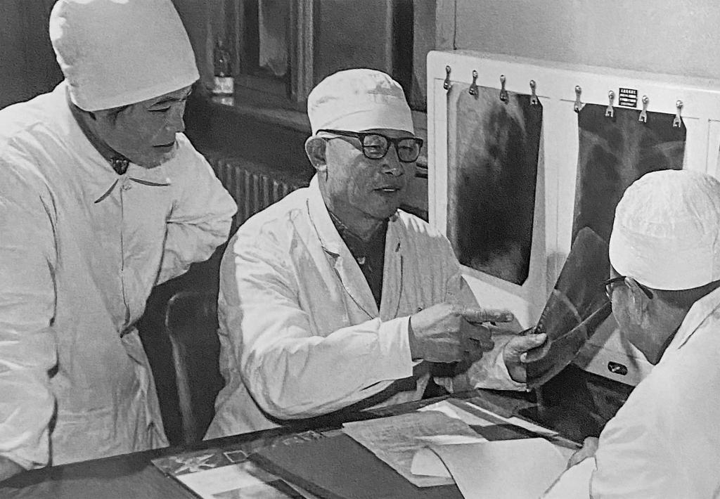 1980年1月16日,辛育龄(中)在内蒙古结核病院与胸外科医师讨论病例(翻拍照片)。新华社记者张玉薇摄