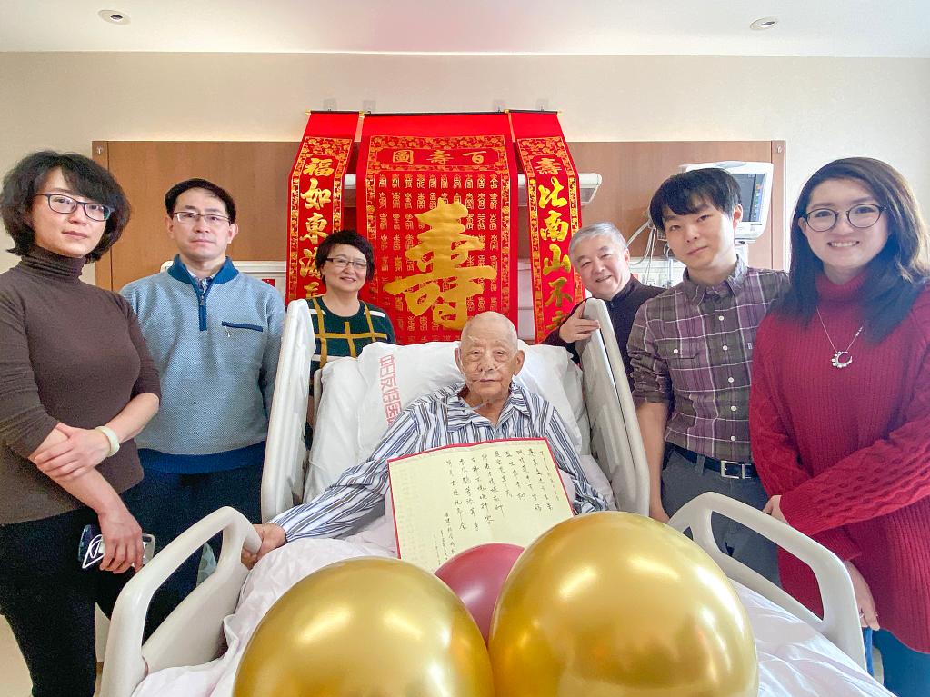 2021年2月12日,辛育龄在北京中日友好医院庆祝百岁生日,与家人合影。新华社发(蔡莹莹摄)