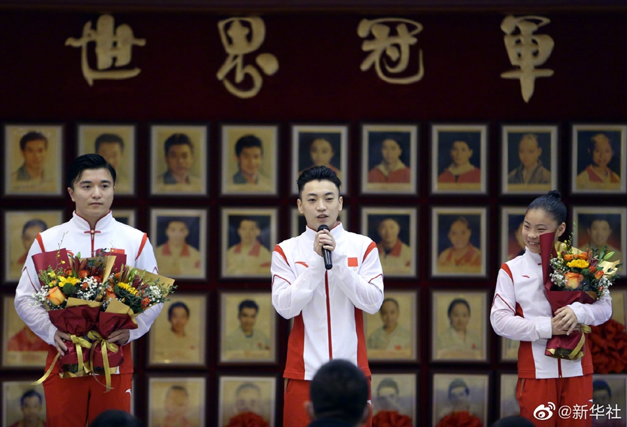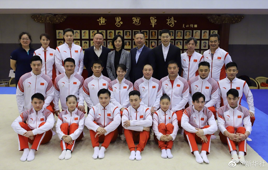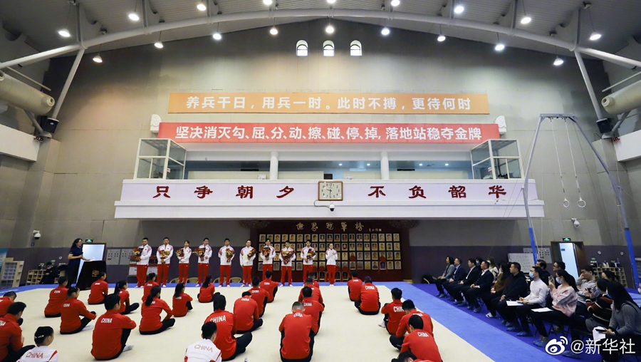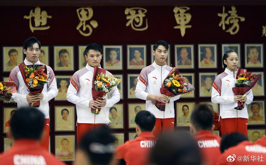 29日,2021年中国体操队新奥运冠军、世界冠军登榜仪式在国家体育总局举行。东京奥运会男子吊环冠军刘洋、男子双杠冠军邹敬园、女子平衡木冠军管晨辰登上奥运冠军榜,2021年体操世锦赛男子全能冠军张博恒、男子吊环冠军兰星宇、男子双杠与单杠冠军胡旭威以及女子高低杠冠军韦筱圆登上世界冠军榜。祝贺!