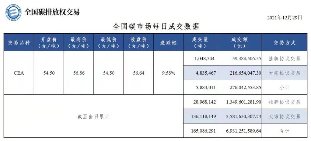 图为全国碳市场12月29日成交数据。(全国碳市场官方微信公众号截图)