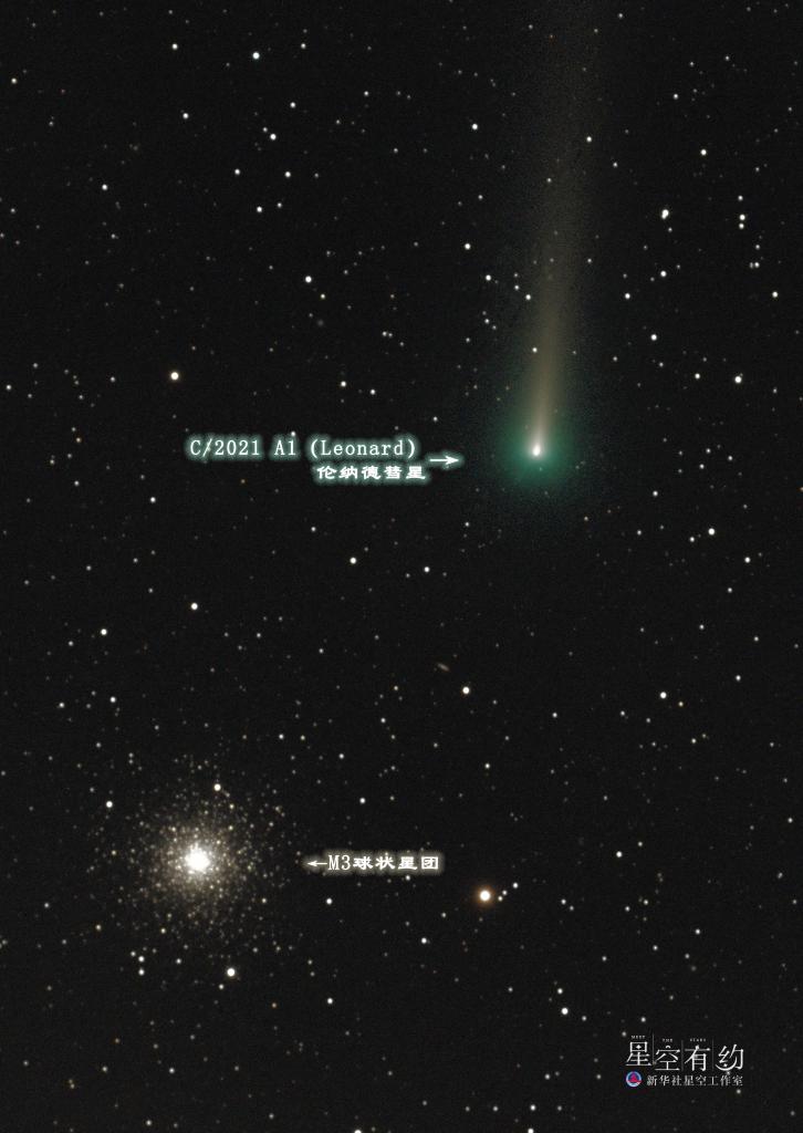 C/2021 A1彗星(即伦纳德彗星)是2021年度“最亮彗星”。“该彗星将于2022年1月3日通过近日点,然后开始逐渐远离太阳系中心的旅程,所以在地球上所观测的亮度正持续减弱。不过这颗彗星在2021年12月20日突然迎来了二次爆发,亮度陡然增加,达到肉眼可见的程度,着实给众多天文爱好者带来了一次不小的惊喜。在飞向太阳的过程中,如果它没有被太阳的强大引力扯碎进而‘香消玉殒’,预估2022年1月上旬的亮度在6等左右。在过近日点前的这几日,在日落后的西南方低空,感兴趣的公众借助望远镜可见它的影踪。但随着时间推移,它在日落时的位置会越来越低,可观测时间也越来越短。”天津市天文学会理事、天文科普专家修立鹏说。