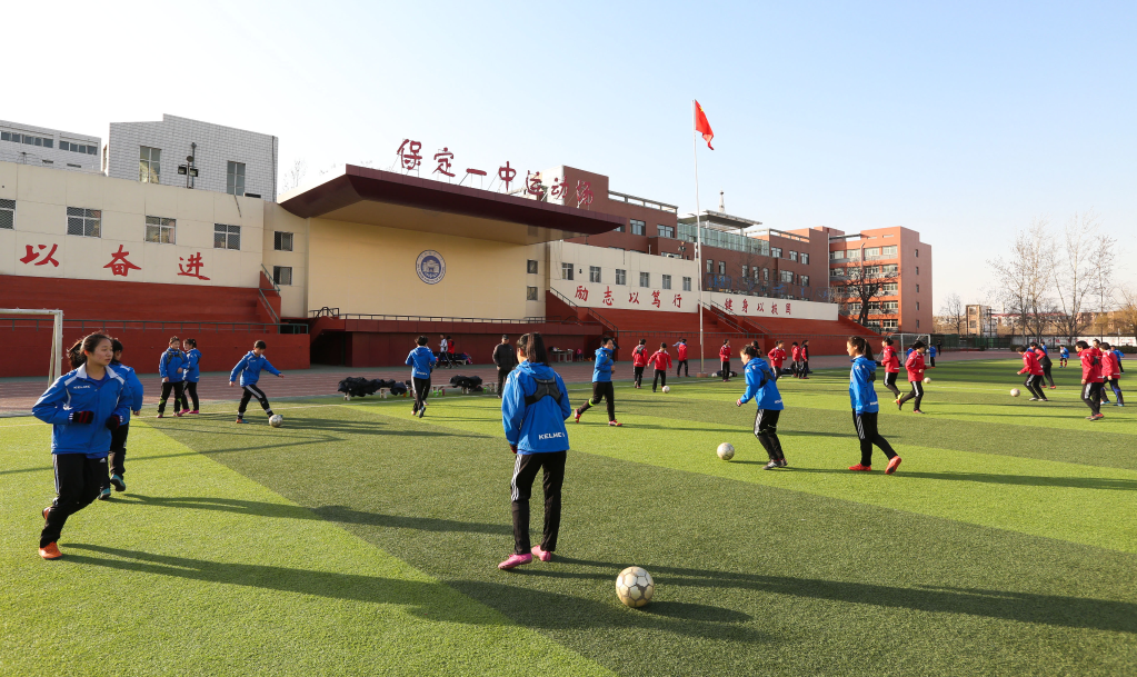 (保定一中校女足队员们正在训练。保定一中供图)