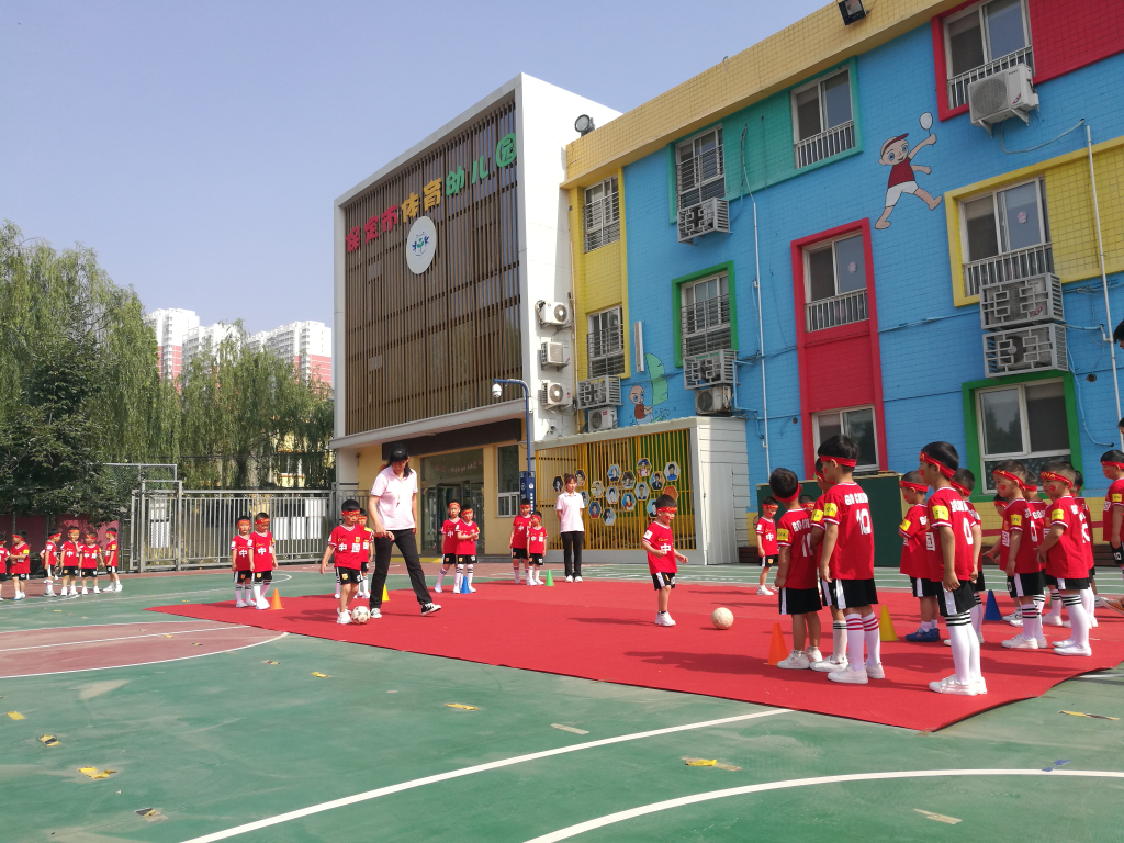 (保定市体育幼儿园的孩子们在上体育足球课。保定市体育幼儿园供图)
