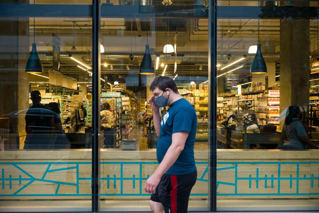 8月11日,一名男子从美国华盛顿一家食品超市前经过。(新华社发 沈霆摄)