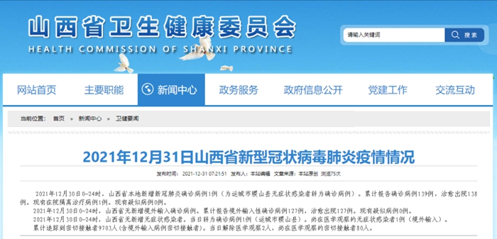 2021年12月31日山西省新型冠状病毒肺炎疫情情况