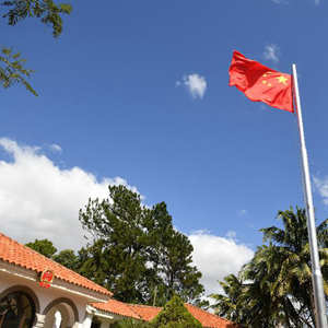 2021年12月31日,在尼加拉瓜马那瓜的中国驻尼加拉瓜大使馆,五星红旗在空中飘扬。 新华社记者 辛悦卫 摄