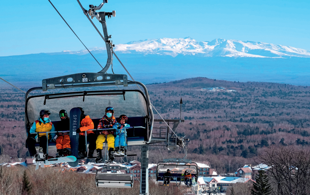 ▲ 2021年11月15日,滑雪爱好者在长白山国际度假区滑雪场乘坐缆车 许畅摄 / 本刊