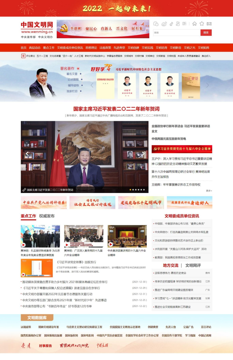 全新改版的中国文明网突出习近平新时代中国特色社会主义思想的网上宣传。权威发布中宣部、中央文明办主体工作,展示交流宣传思想工作和精神文明建设丰硕成果,强化新时代文明实践、文明创建、文明培育建设的工作特色,讲好中国故事、促进文明交流互鉴,推动形成文明传播新媒体矩阵。新版按照简明、实用、可拓展的原则,共开设信息发布、文明数据库、文明之光、政策文件、评论言论等重点板块和栏目,结构清晰明快,界面交互简洁,依托新华网技术支持,具有较强适用性、拓展性。