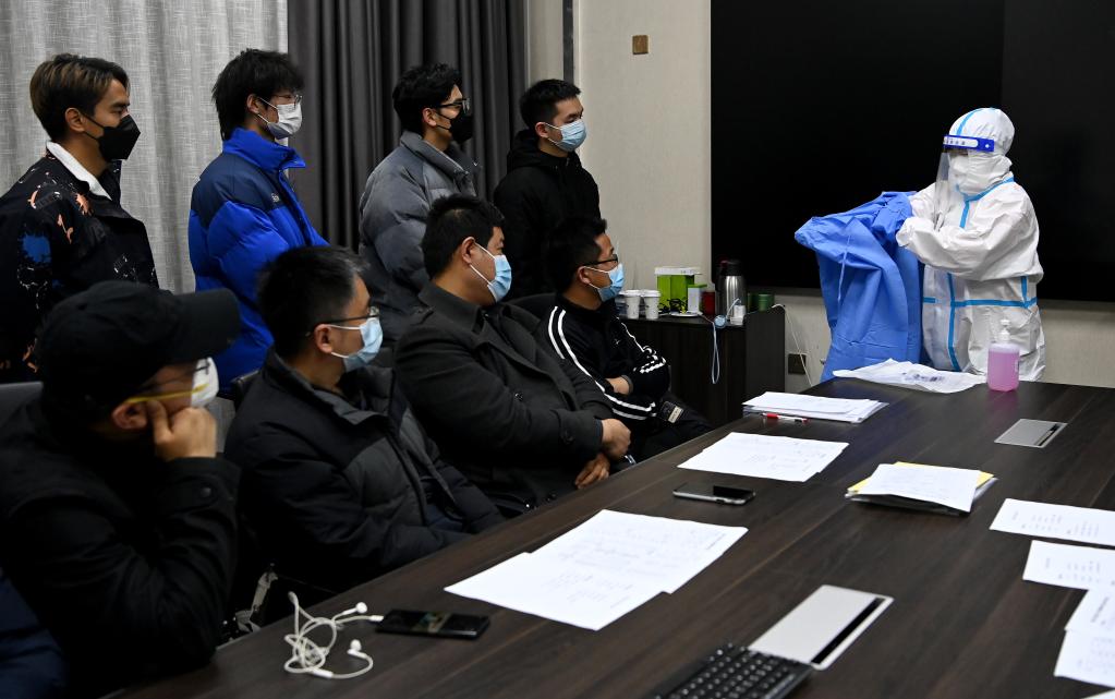 2021年12月24日,在西安外国语大学,医务人员为即将前往隔离酒店送考上门的师生讲解防护服穿脱的注意事项。新华社记者刘潇 摄