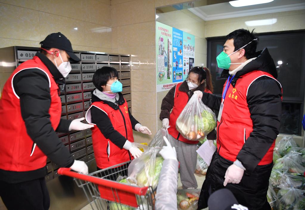 2021年12月31日,西安曲江风景线小区,志愿者分拣免费生活物资。新华社记者 张博文 摄
