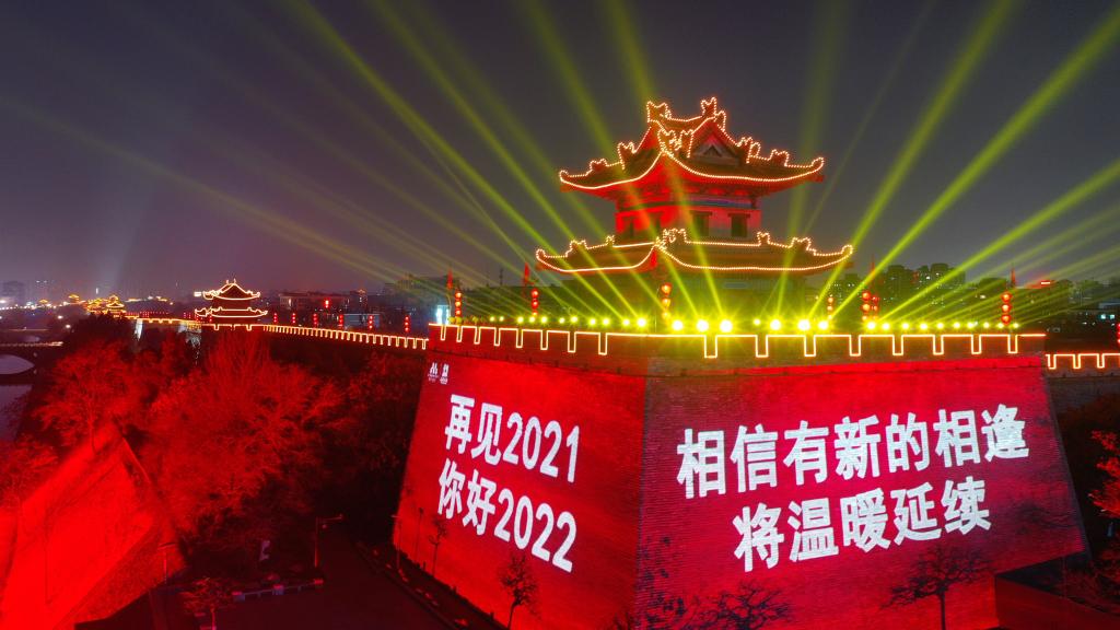 2021年12月31日拍摄的西安城墙灯光秀(无人机照片)。新华社记者 陶明 摄