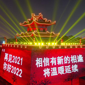 新年的钟声刚刚敲响,一束光影打在西安古城墙上,映出几行字迹。