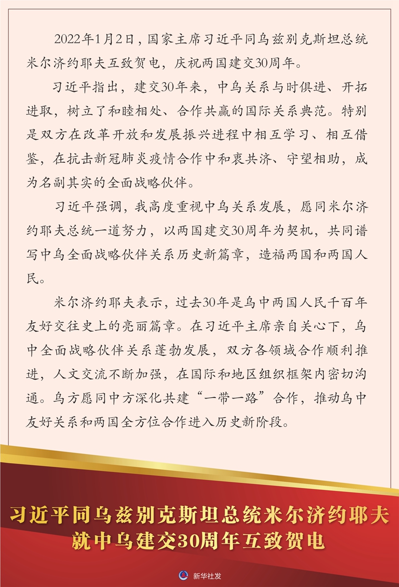 新华社北京1月2日电 2022年1月2日,国家主席习近平同乌兹别克斯坦总统米尔济约耶夫互致贺电,庆祝两国建交30周年。