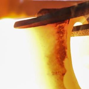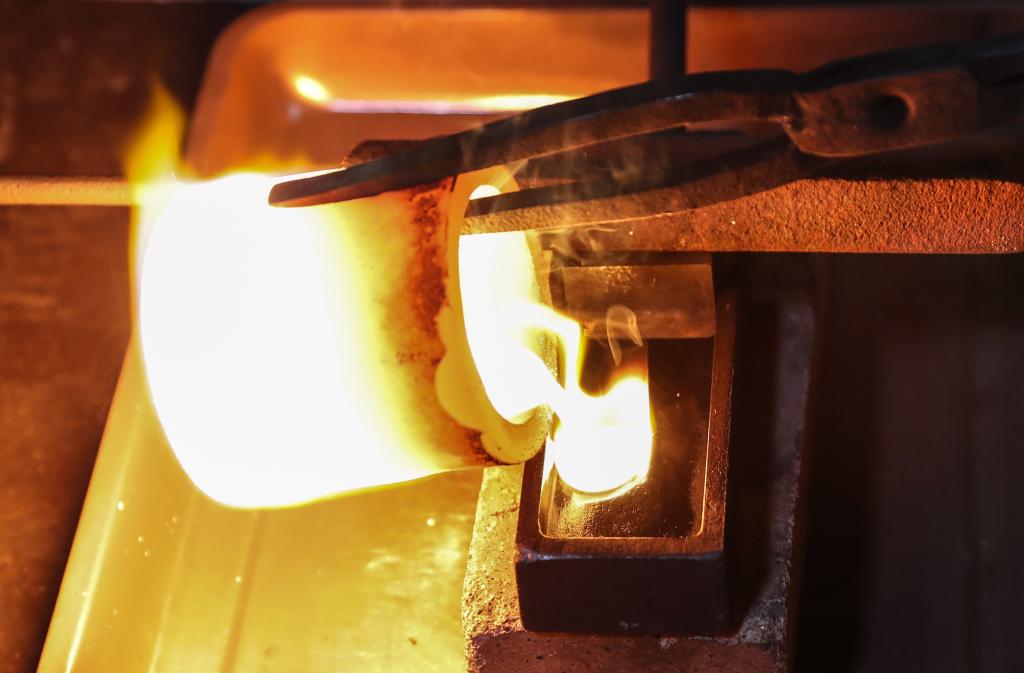 2019年12月12日,在南京金线金箔总厂,工人将熔化的金水倒入容器。(新华社记者杨磊摄)