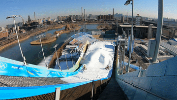 ⬆️这里就是出发区,你的背后是五环,眼前是陡峭不见底的坡道。你将从这里脚踏雪板,冲下陡坡,一跃而起,空翻回转,稳稳落地......