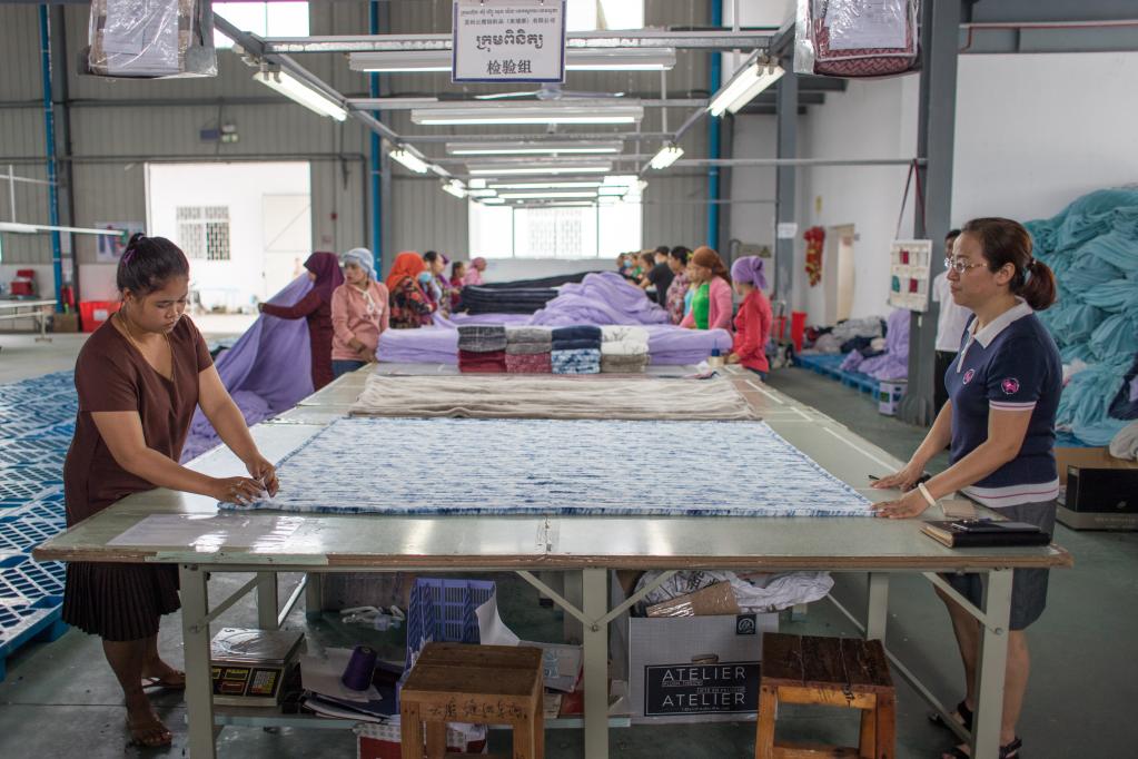 2019年3月19日,在柬埔寨西南部西哈努克省的西哈努克港经济特区的苏州云鹰纺织品(柬埔寨)有限公司,阿青(左)帮忙验货。(新华社记者朱炜摄)