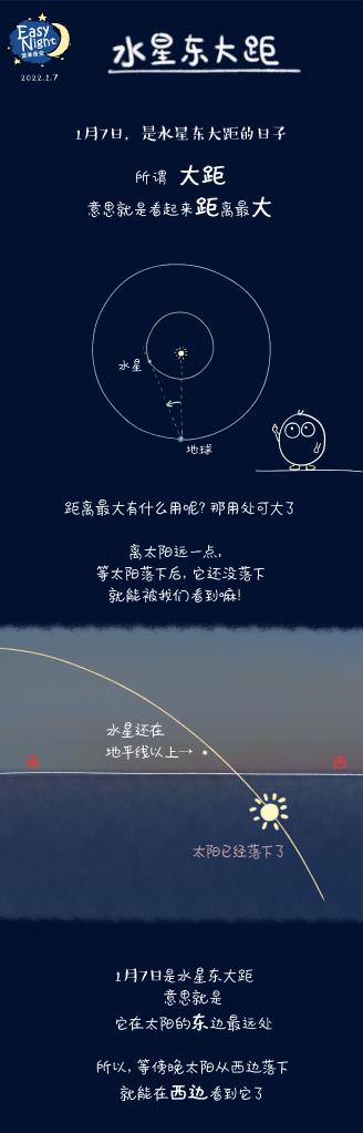 新华社天津1月5日电(记者周润健)2022年首场水星大距即将上演。天文科普专家介绍,1月7日,水星将迎来东大距,如果天气晴朗,感兴趣的公众可在黄昏时分,借助双筒望远镜或是小型天文望远镜一睹水星“芳容”。