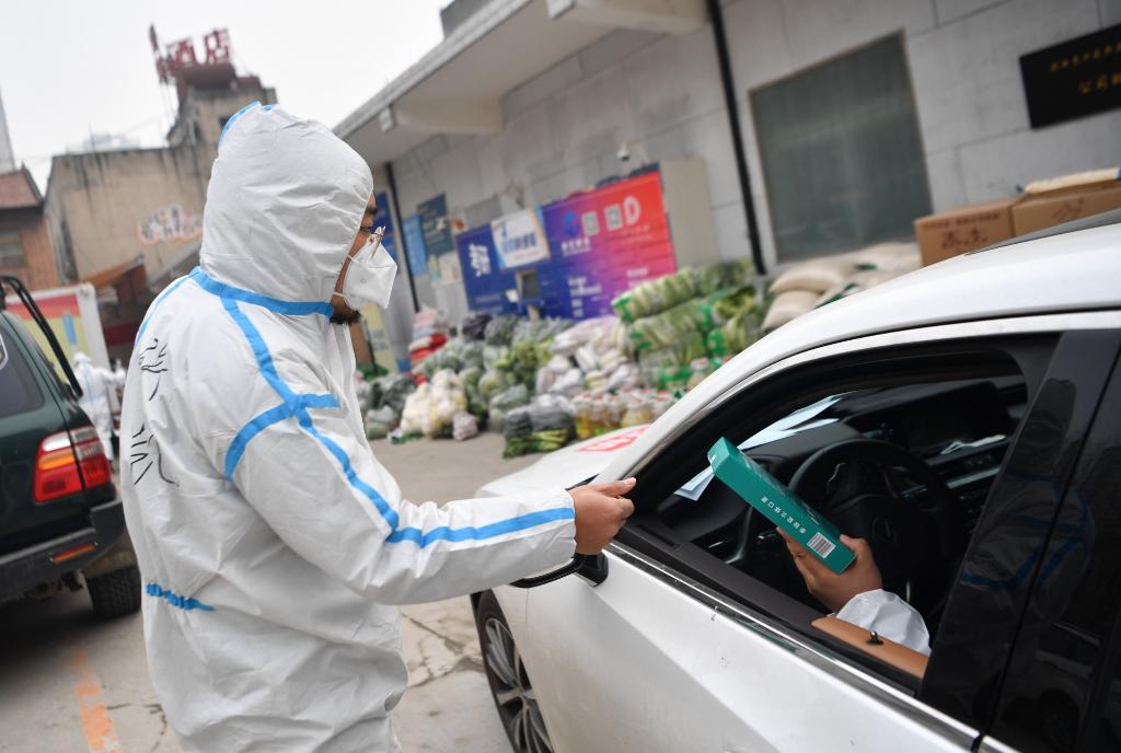 1月4日,在西安市雁塔区,志愿者畅璘将食品送至一位负责运输核酸检测样本的救护车驾驶员手中。新华社记者 张博文 摄