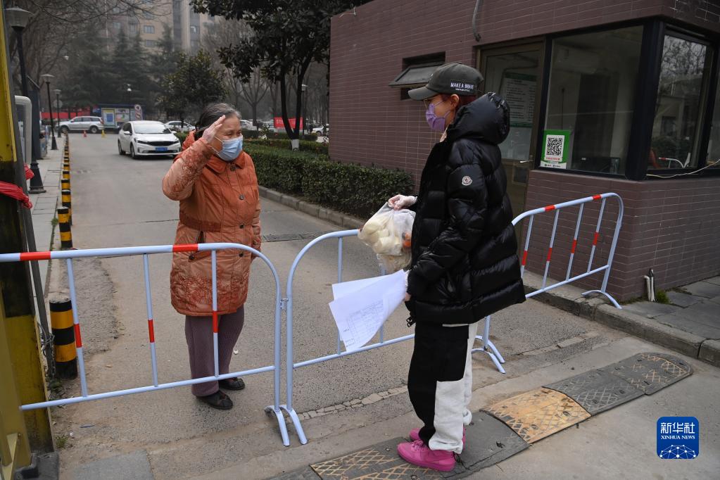 1月5日,西安市北辰大道一社区82岁的金礼芳老人(左)收到志愿者送来的生活物资。新华社记者 陶明 摄