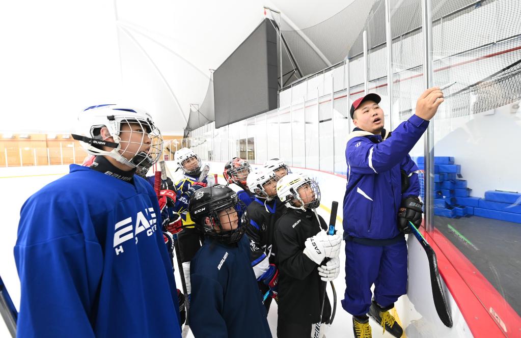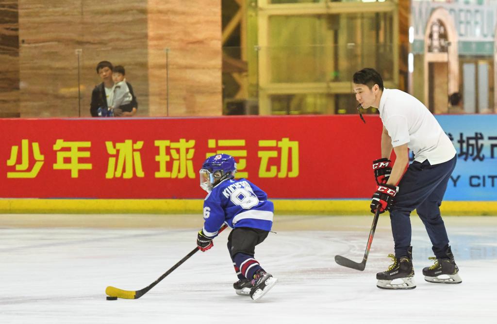 2022年1月5日,在四川省成都市环球中心冠军滑冰场,冰球教练崔钧玺(右)在场上规范球员技术动作。新华社发(孙凡越通联)