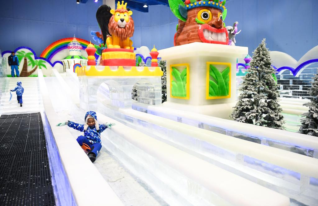 2019年6月18日,小朋友在广州融创雪世界炫彩冰雕区游玩。新华社记者邓华摄