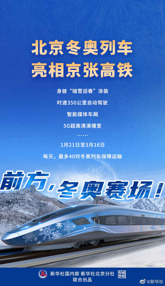 6日,北京冬奥列车亮相京张高铁。时速350公里自动驾驶,列车发车、运行、停车、车门开闭全自动,运行状态自感知,各类故障精准预测;“瑞雪迎春”涂装,智能媒体车厢,高铁移动主题邮局,无障碍设施应用,人性化客舱设计,信息交互、灯光调节智能化,“雪之梦”多语言服务;再配上世界上首个时速350公里高铁5G超高清演播室……依托京张高铁智能复兴号运营经验和先进技术,北京冬奥列车专为北京冬奥会量身定制。(记者樊曦、丁静,海报设计杨轶群)