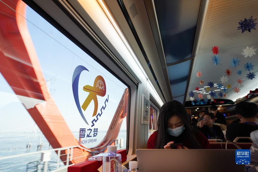 当日,北京冬奥列车亮相京张高铁。据介绍,北京冬奥列车全部使用时速350公里复兴号动车组开行,并配备5G超高清演播室。冬奥列车编组8辆,定员564人,外观采用“瑞雪迎春”涂装方案,彰显冬奥主题。