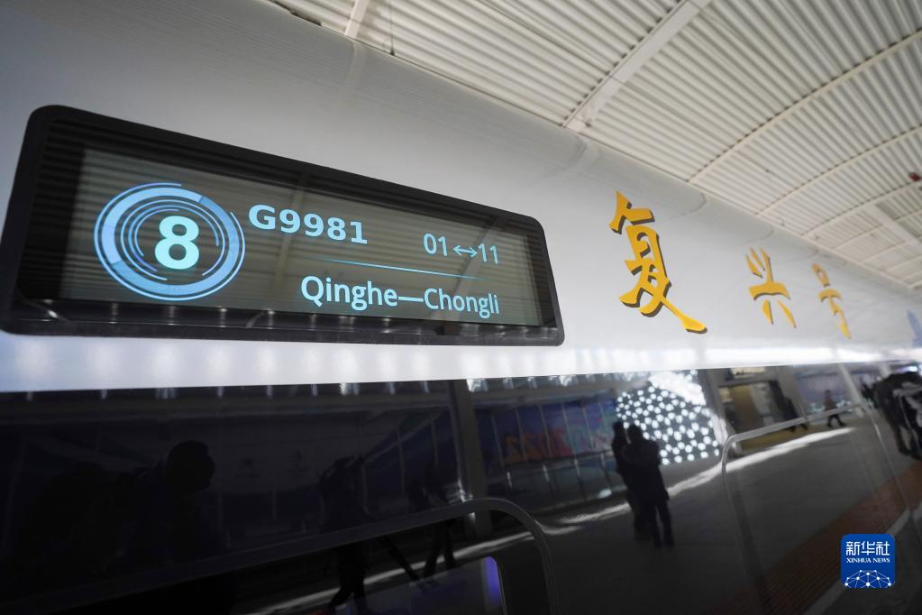 当日,北京冬奥列车亮相京张高铁。据介绍,北京冬奥列车全部使用时速350公里复兴号动车组开行,并配备5G超高清演播室。冬奥列车编组8辆,定员564人,外观采用“瑞雪迎春”涂装方案,彰显冬奥主题。