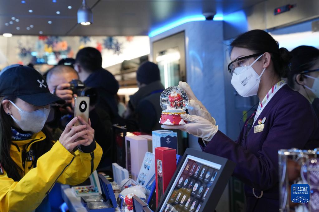 1月6日,在G9981次北京冬奥列车车厢内,一位工作人员在介绍北京冬奥会特许商品。