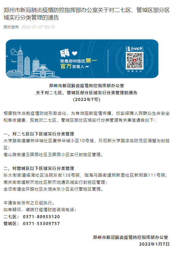 根据我市当前疫情防控形势变化,为有效阻断疫情传播,切实保障人民群众生命安全和身体健康,现就对二七区、管城区部分区域实行分类管理有关事宜通告如下: