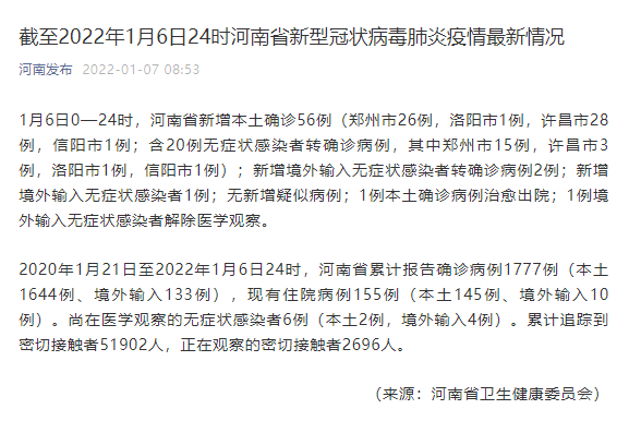 1月6日0—24时,河南省新增本土确诊56例(郑州市26例,洛阳市1例,许昌市28例,信阳市1例;含20例无症状感染者转确诊病例,其中郑州市15例,许昌市3例,洛阳市1例,信阳市1例);新增境外输入无症状感染者转确诊病例2例;新增境外输入无症状感染者1例;无新增疑似病例;1例本土确诊病例治愈出院;1例境外输入无症状感染者解除医学观察。