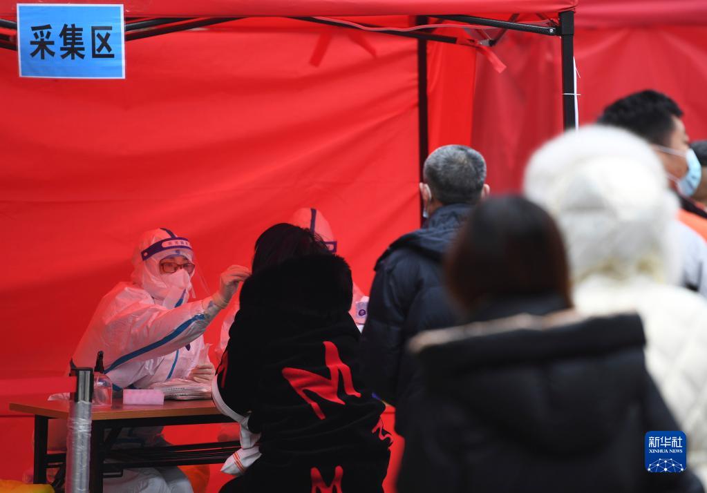 1月7日,在郑州市金水区花园路街道办事处省银行社区核酸检测点,医务人员为市民进行核酸检测取样。