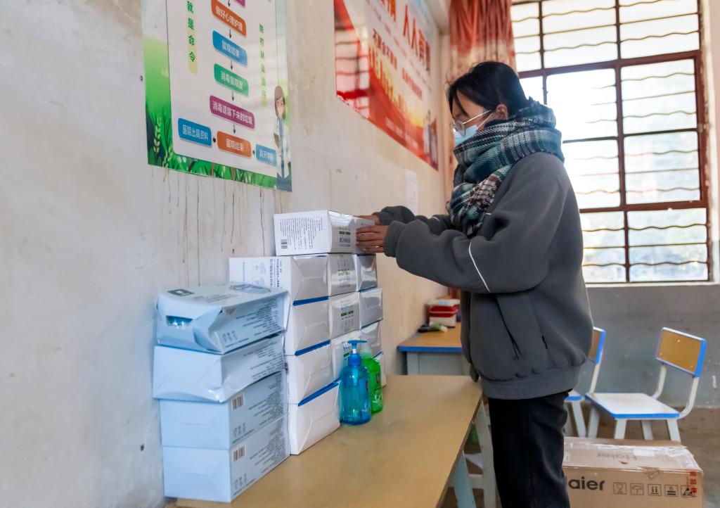 1月4日,永宁镇中心完小教职工在整理防疫物资。 新华社记者 陈欣波 摄