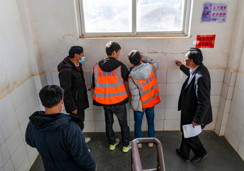 1月4日,永宁镇中心完小教职工协助住建部门查看教学楼受损情况。 新华社记者 陈欣波 摄