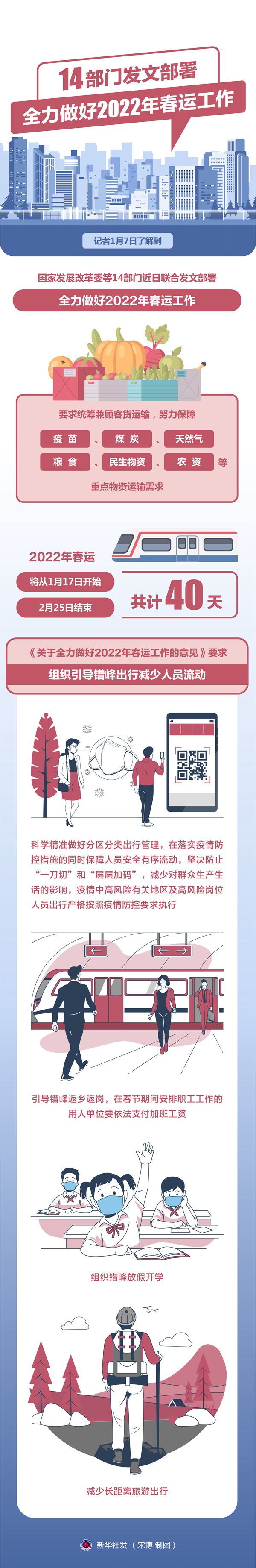 2022年春运将从1月17日开始,2月25日结束,共计40天。《关于全力做好2022年春运工作的意见》要求,组织引导错峰出行减少人员流动。科学精准做好分区分类出行管理,在落实疫情防控措施的同时保障人员安全有序流动,坚决防止“一刀切”和“层层加码”,减少对群众生产生活的影响,疫情中高风险有关地区及高风险岗位人员出行严格按照疫情防控要求执行。引导错峰返乡返岗,在春节期间安排职工工作的,用人单位要依法支付加班工资。组织错峰放假开学。减少长距离旅游出行。