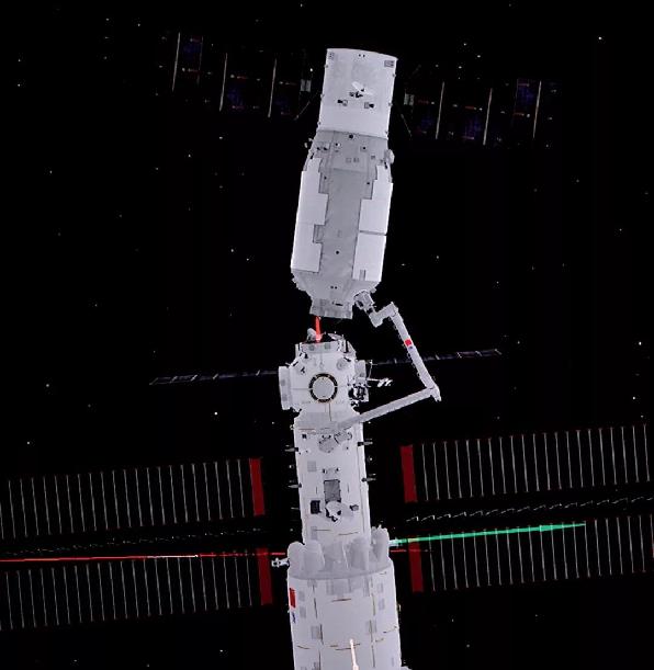 ▲ 2022年1月6日在北京航天飞行控制中心拍摄的空间站机械臂转位货运飞船试验,天舟二号货运飞船在机械臂拖动下以核心舱节点舱球心为圆心进行平面转位 郭中正摄