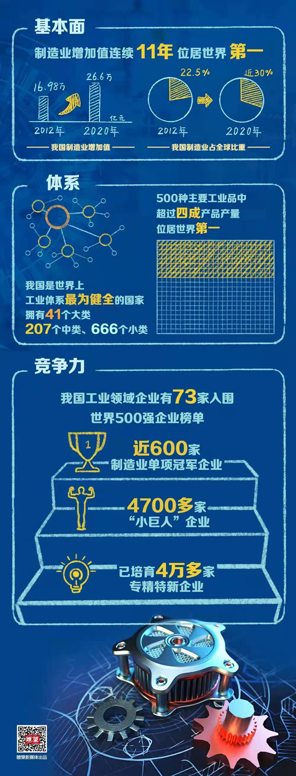 ◆ 最新发布的世界500强企业榜单中,我国工业领域企业有73家入围。已培育4万多家专精特新企业、4700多家“小巨人”企业、近600家制造业单项冠军企业。中国制造在全球产业链供应链中的影响力持续攀升