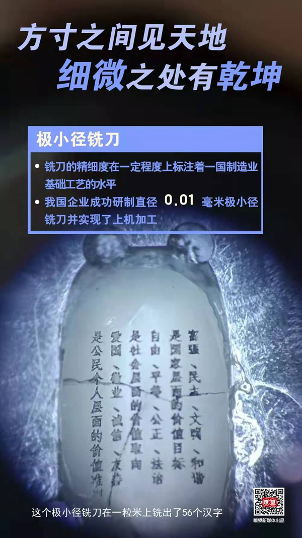在一粒米上铣出56个汉字,在一根头发丝上铣出7个字母……不久前,中国五矿所属中钨高新金洲公司成功研制直径0.01毫米的极小径铣刀,实现上机加工。