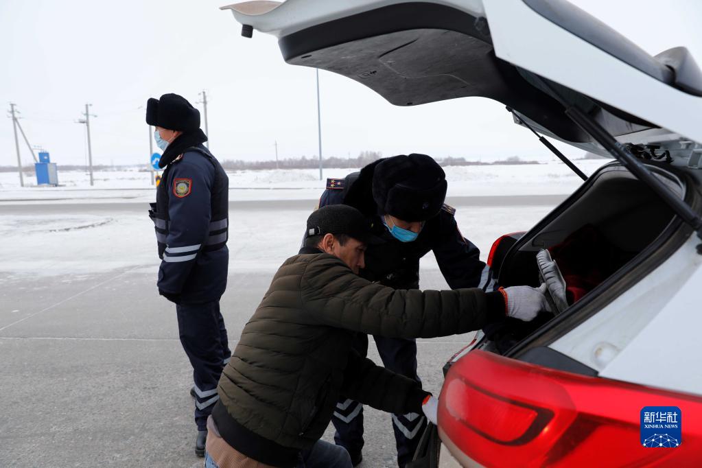 1月7日,哈萨克斯坦执法人员在努尔苏丹的进出城检查站进行巡查。