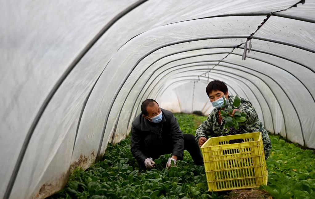 1月7日,西唐寨村村民陈彩侠(右)和爱人在自家菜地收菜。新华社记者刘潇摄