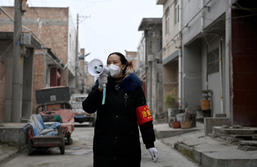1月7日,西唐寨村志愿者在呼喊防疫提醒。新华社记者刘潇摄