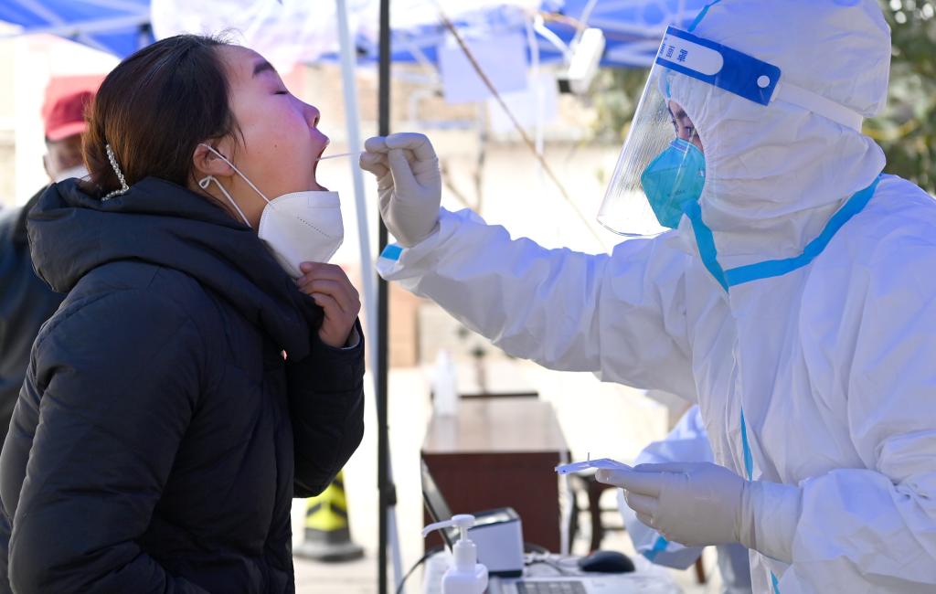 1月7日,西唐寨村的村医在给重点人群进行核酸检测。新华社记者刘潇摄