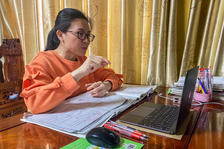 ↑1月5日晚,东兴中学一名家住疫情封控区的老师在家为高三学生上网课(受访者供图)。