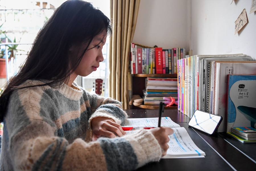 ↑1月6日,东兴中学高三学生彭国梅在家上网课。