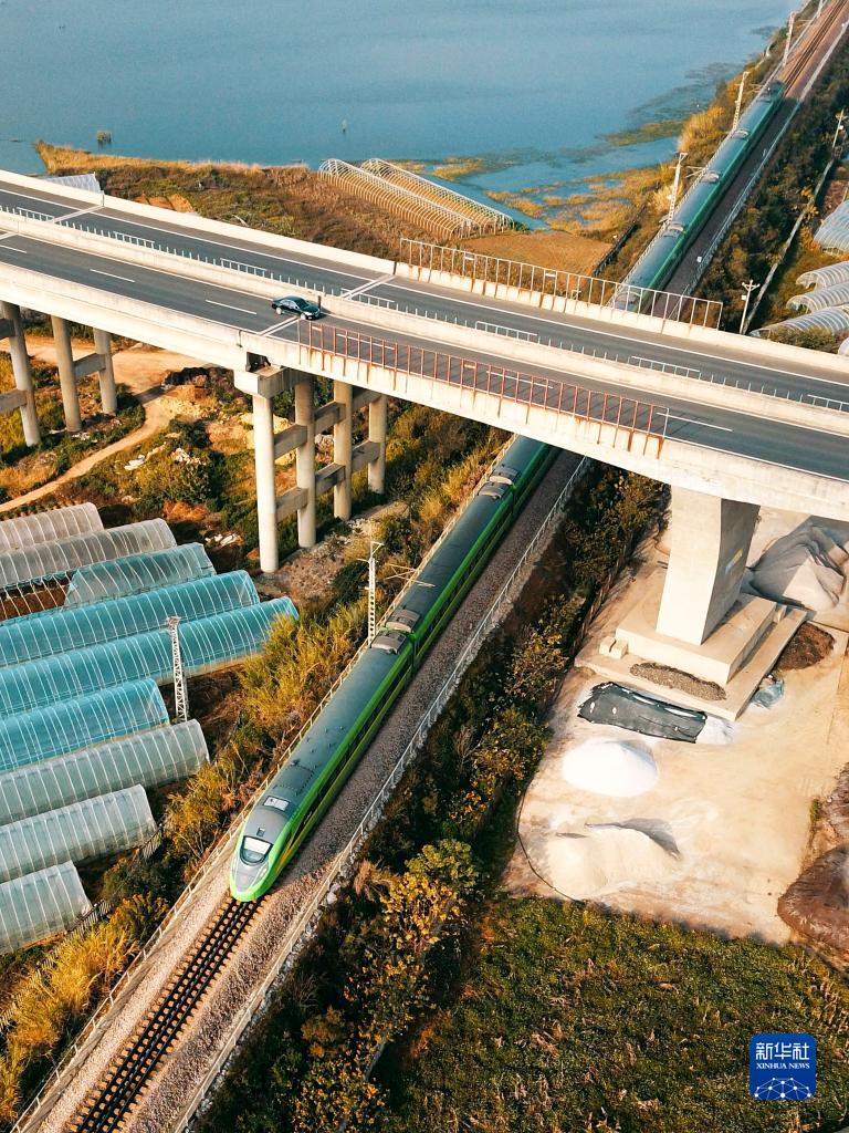 1月9日,动车组列车行驶在云南省红河哈尼族彝族自治州个旧市境内(无人机照片)。