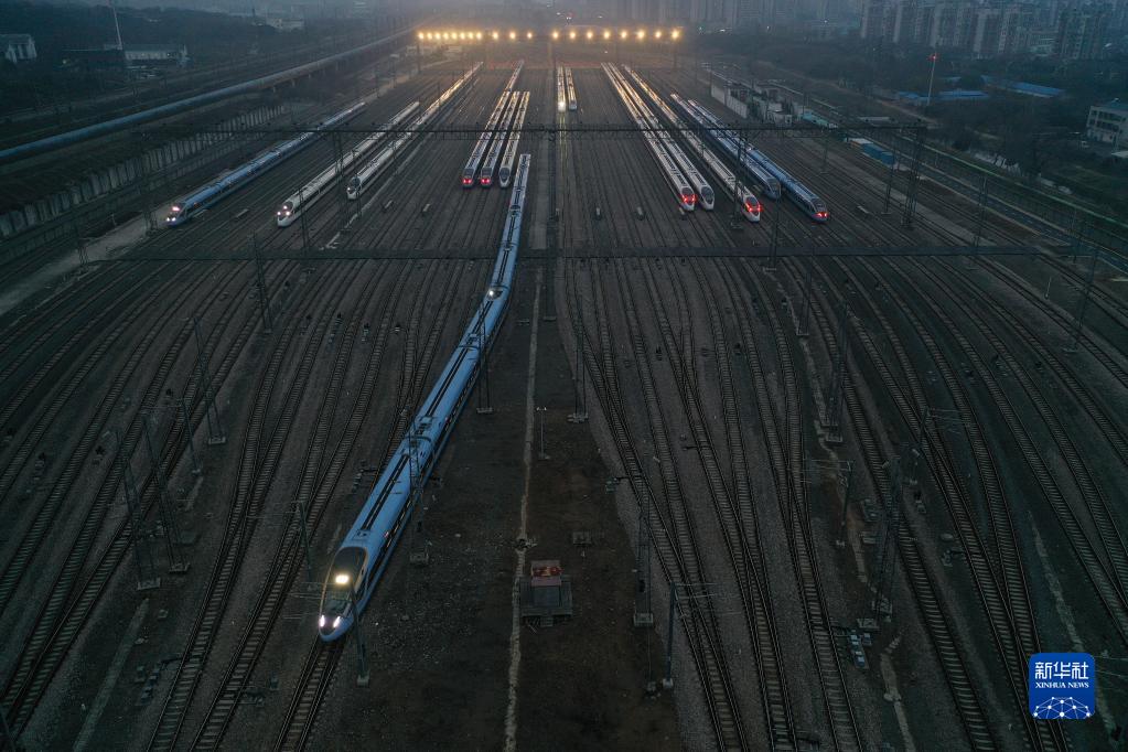 1月9日,动车组列车从南京动车段南京南动车运用所驶出(无人机照片)。