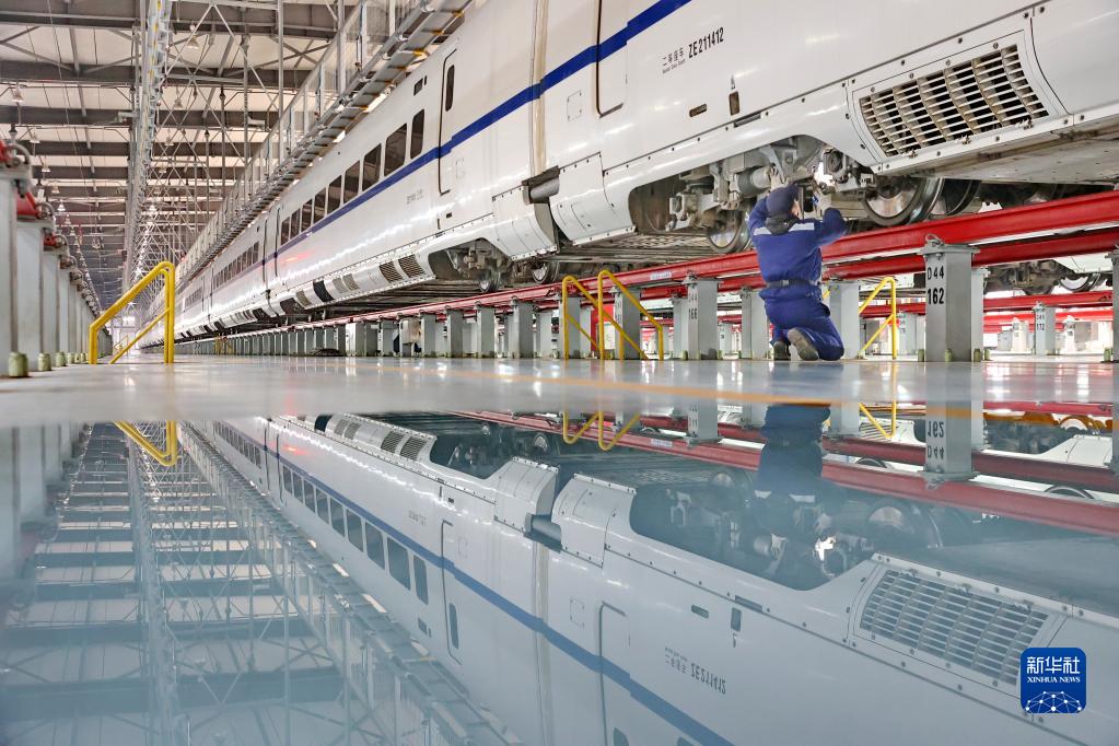 1月9日,一位地勤机械师在江苏南通动车运用所存车库检查车侧转向架部件。